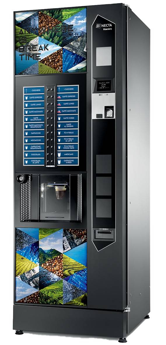 Extrêmement élégant, avec des profiles externes en aluminium anodisé noir, une porte noire et un socle gris foncé ainsi qu'un grand clavier de sélection : c'est Maestro, le distributeur qui complète l'offre de Necta pour les sites les plus exigeants.