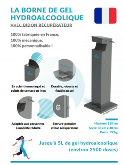 Il possède un récupérateur de gel hydroalcoolique afin d'éviter que le gel en surplus coule au sol ou le long de la borne.